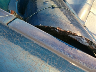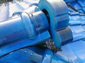 冠瓦や鬼瓦まわりに詰めてあった漆喰も全部とれてしまっています。ここから雨がどんどん入っていって、内側から棟を崩してしまう事になります。