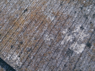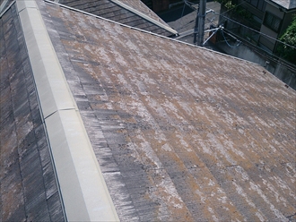 屋根はスレート葺きで初めてのメンテナンスという事で、傷みが結構でていました。もともとは黒色のスレートだったのですが、塗装が剥がれてコケも生えています。勾配がキツいので歩くとズルズルと滑りそうなくらいでした。全体的にスレートが反っていて放っておくと割れてしまうでしょう。