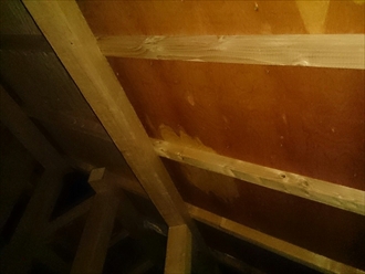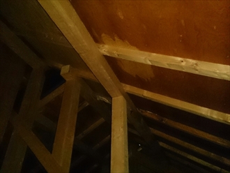 雨漏りしている部分の小屋裏です。奥の方の垂木に白くカビが生えていました。雨漏りは棟板金と他にもう一つ理由があります。