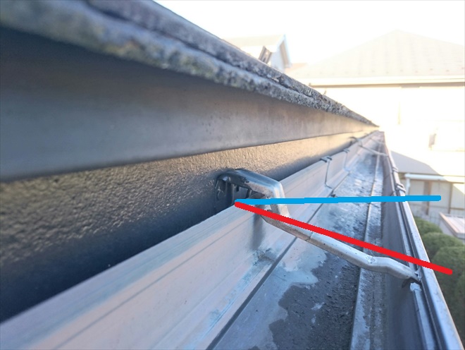 元々は青いラインの位置に雨樋が設置されていましたが、屋根から雪が落ちる時に雨樋を押し下げてしまい、現在では赤いラインの位置になっています。これでは本来の排水量を確保出来ずに、雨量が多くなってしまうと外側からあふれてしまいます。