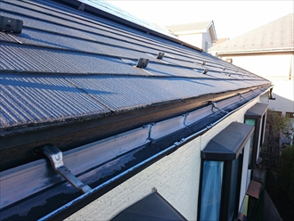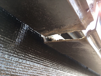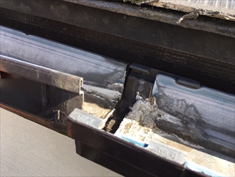 雨樋は屋根の長さにもよりますが、端から端まで1本では届かないのでジョイントが必ず出来ます。ジョイントは専用の部材を使って接着して納めますので、台風などの強風で力が掛かかると接着が剥がれて外れてしまいます。大きな隙間があいて雨水が大量に落ちてしまう事になります。雨樋が破損していると落ちた雨水の泥はねなどで建物を汚損してしまったり、お隣にもご迷惑をかける事がありますので、早急に直しましょう。横浜市保土ヶ谷区で今回調査した建物は、雪と強風によって雨樋が曲がったり破損していましたので、火災保険が適用出来るのであれば有効に活用して元通りに交換工事をしていきます。