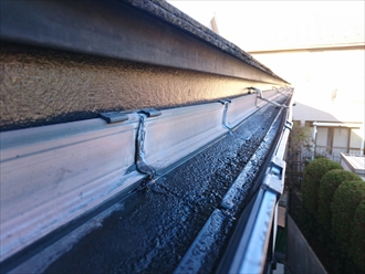 普通の降り方だと雨水が落ちてくることはないそうですが、少し強く降った時には雨樋の外側からバシャバシャと落ちてくるそうです。状態を確認してみると外側に傾いていて、雨樋の中に雨水が溜まった跡もありました。