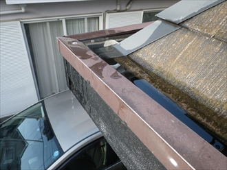 しばらくすると、水が滝のように流れてきました。原因は溜まった雨水が笠木の裏側にまわって軒裏まで流れていることがわかりました。