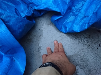 雨漏りしている上はバルコニーになっています。雨漏りしているのでブルーシートを敷いていますが、雨漏りは止まっていない様です。シートをめくると床がブヨブヨになっていました。大分雨水の影響を受けているので、下地の状態が心配です。