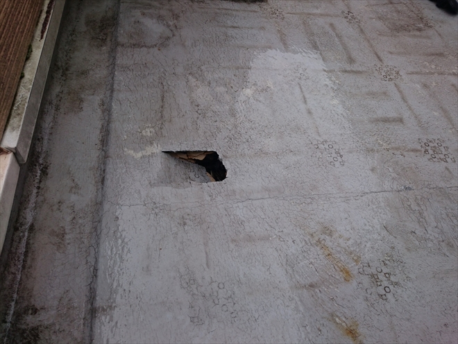 シートをめくると雨漏りの一番の原因がわかりました。床に大きな穴が開いています。これでは大量の雨水で雨漏りしてしまうのは当たり前ですね。防水に問題が無ければこの様に下地が傷むことはありませんが、防水材のひび割れなどから雨水が回り、下地を腐食させてしまった様です。この状態ですと、床を全て剥がして下地を造り直してから新しい防水工事をおこなわなければなりません。費用はかかりますが、建物の柱や梁などが腐食してしまったら大変ですので、すぐにでも防水を直して雨漏りをしっかり止めなければなりません。横浜市南区の雨漏りの原因は、バルコニーの防水に穴が開いた事ですので、原因がわかれば後は適切な工事をおこなうだけです。早く直して安心してお住まいになれる様にしましょう。