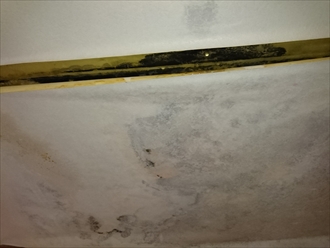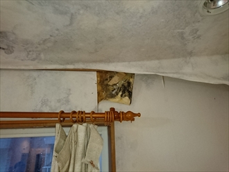 室内の壁と天井には広範囲で染みが広がっています。クロスは剥がれて下地の石膏ボードはカビだらけになって真っ黒です。一旦濡れてしまった石膏ボードは触ると崩れる程劣化しますので、木の下地も大分腐食していそうです。