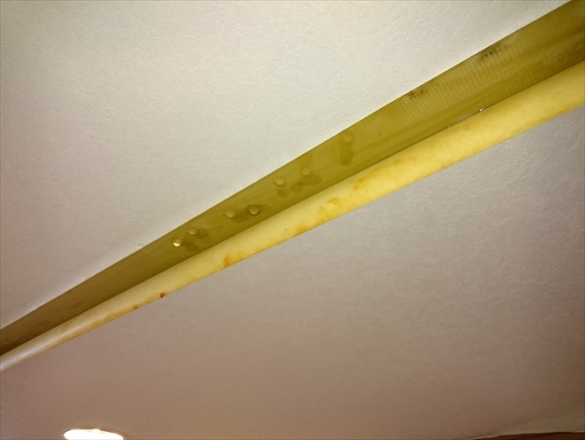 クロスが剥がれた天井部分からは、雨漏りした雨水が染み出してきています。調査している最中に雨が降っているので、どこが原因になっているのか確認してみましょう。