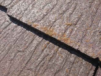 スレートは年数が経過すると太陽からの紫外線や風雨によって表面が劣化していきます。表面が劣化していくと撥水性が無くなってしまい雨が降ると雨水を弾かずに吸い込む様になってしまいます。塗れた状態から表面だけが先に乾くと反りに繋がったり、収縮に差が出てヒビ割れに繋がってしまいます。