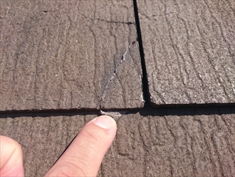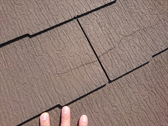 ヒビ割れも何箇所か出ていますが、スレートが脱落する程ではありません。大分古いヒビ割れ後がありますので、新築時に既にヒビが入っていたところもある様です。全体を見てみましたが、築10年でこの劣化具合でしたら問題無く塗装工事が可能です。横浜市南区のスレート屋根はヒビ割れが出ていますが、塗装工事で見た目も綺麗にして劣化の進行を遅らせる事も出来ますので、耐久性が高い塗料で次回までのメンテナンス期間を延ばしていきましょう。