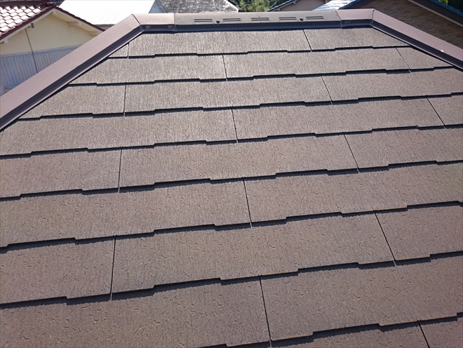 築10年を経過したスレート葺きの屋根は見たところ特に問題は無さそうです。表面が劣化している部分は見当たりません。