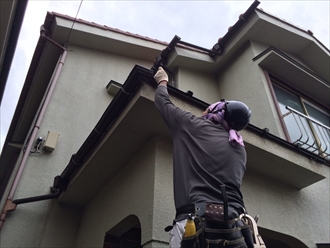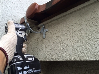 勾配をみて吊り込み金具の取付位置を決めます。もともとの繋ぎの様に新しい雨樋を吊り込んでいきます。