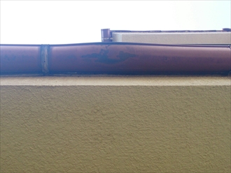 台風で外れてしまった軒樋です。風によって割れていましたので修理をしなければならないのですが、現在生産されていない雨樋なので繋がっている部分は全部交換が必要です。歪みも出ています。