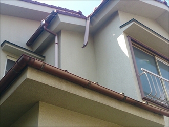 大屋根の次に下屋の軒樋を吊って完成です。雨樋が壊れていると落ちてきた雨水によって建物の外壁や下屋を傷めてしまう事もあるので、早めに修理しましょう。