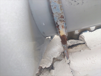 写真だとちょっと分かりにくいのですが、雨トヨが歪んでいます。上から雪の重みで押されて曲がってしまった様です。吊り込み金具は曲がっていなくても、雨トヨが捻じれているので、雨が降るたびに雨トヨの内側と外側から雨水が漏れてきます。