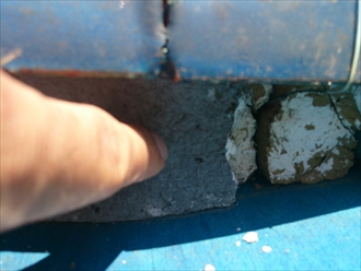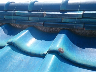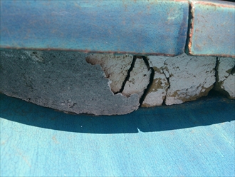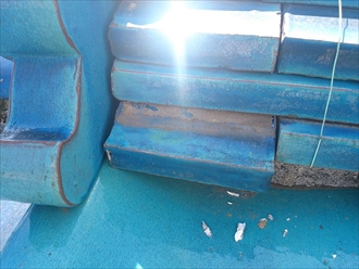 屋根の瓦の状態です。ずれなども無く野地板に傷みが無いので状態は比較的良さそうです。のし瓦がズレて外側に広がってきていますが、棟が崩れそうな程ではありません。タイトルの『適当な事を言う』とは、瓦屋根をラバーロックしなければ駄目だ!といった事です。ラバーロックとは、瓦がズレない様に固定をする工法で、瓦の重なり部分の隙間にコーキング等を詰めて動かないようにするのですが、瓦の重なり部分の隙間は屋根にとって大切な隙間です。安易に、瓦が動く→固定して動かなければ良い!といった考え方では屋根がダメになってしまいます。その様な事を言う業者には注意してください。