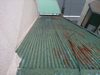 雨漏りしている天井部分です。天井板が濡れてしまい今にも落っこちそうな状態です。原因となっているのは屋根です。波板トタン葺きで全面にサビが出てきていました。何箇所か穴があいていてテープで塞いであります。波板トタンの固定方法は、屋根の上から木下地にむけて釘で止めているので、それでは雨漏りして当たり前です。屋根が穴だらけでは雨漏りしてしまいますよね。