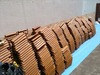 杉の野地板の上にコンパネを貼っていきます。屋根の下地の為と、補強の為です。建物は左右の揺れ以外にも捻じれがあります。合板で補強することで、その捻じれに強くなるんです。降ろした瓦がこれだけありました。まだ半分くらいなのですが、瓦屋根はやっぱり重いんだなあ、と実感しました。