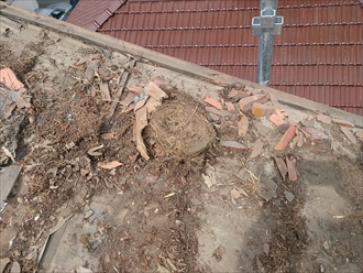 瓦を剥がすと下から大量のゴミが出てきました。瓦を梱包していたテープやダンボールがゴッソリとありました。瓦工事の際に出たゴミをそのまま下に詰め込んでいた様です。結構以前の建物だと良く見る光景ですが、お客様の建物にゴミを捨てているのですから、憤慨ものです。右の写真は古いツバメの巣です。毎年燕が飛んでくるのは楽しみなものですが、糞などによって建物を汚したり傷んだりと余り良いものではありません。
