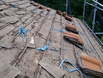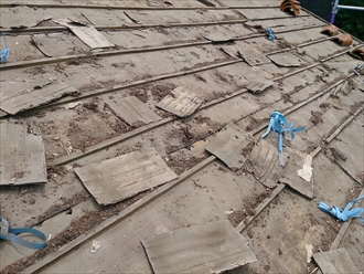 既存の瓦屋根を解体していきます。瓦を剥がすと瓦桟が見えます。この瓦桟に瓦を引っ掛けてズレない様にして葺いていきます。
