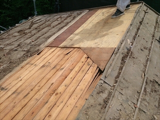 溜まっていたホコリやゴミなどを、古い防水紙ごと巻き取って行きます。周りを汚さないしホウキで掃いてホコリを舞上げる事もありませんので、なるほど!と感心してしまいました。古い野地板は杉板を並べて作っていましたが、一部コンパネ(ベニア)を張っている部分は増築工事をおこなった跡の様です。