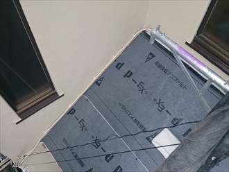 横浜市旭区で着工中の現場です。カバーしてある屋根を葺替えます。先日撤去工事と下地の野地板工事が終わって防水紙が敷いてあります。本日は生憎の雨でしたが防水紙まで敷いてあれば安心です。屋根材を葺く前に役物の板金を取り付けます。