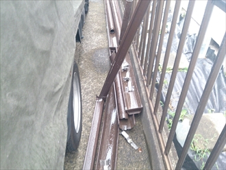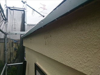 1階の屋根(下屋)部分も葺替えます。2階の屋根(大屋根)と違い外壁と屋根がぶつかりますので、その部分には雨押えという板金の取り付けをおこなって雨水が屋根の裏側に入り込むのを防ぎます。今回の工事では、一緒に雨樋の交換も行いますので、古い雨樋を撤去しました。今よりも大きいサイズでしっかりと雨水を流していきます。