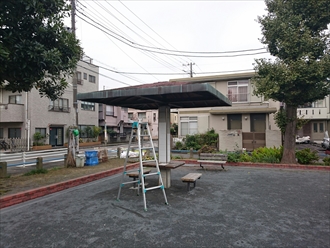 横浜市栄区でボロボロに劣化した公園の東屋(あずまや)の屋根を葺き替えます