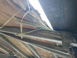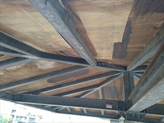 鉄骨の骨組みの上に野地板(合板)が貼ってあり、その上に屋根材が葺いてあるのは住宅と全く変わりません。屋根材がボロボロになっているので、雨水が下地にまで回ってしまい木が腐っています。まだ表面のサビだけですが、このままだと鉄骨の骨組みまで朽ちてしまいます。