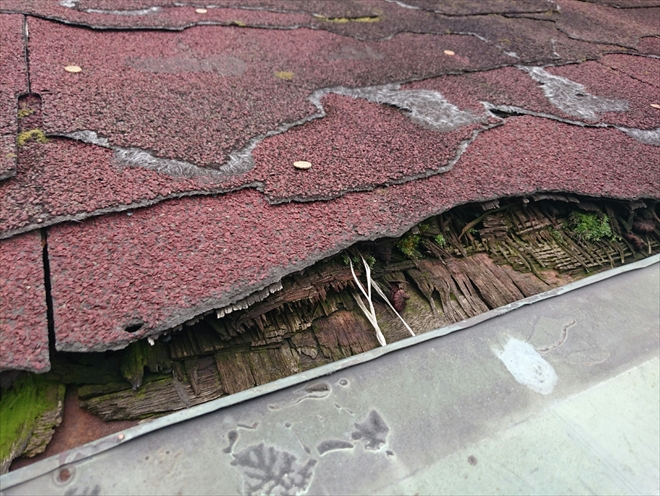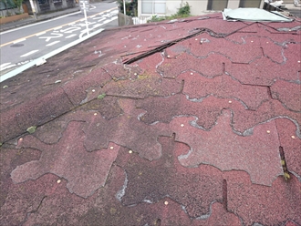 屋根にはアスファルトシングルが葺いてありました。グラスファイバー(ガラス繊維)をアスファルトでコーティングして石粒を吹き付けてある屋根材ですが、紫外線や風雨などによって劣化すると、硬くなってボロボロになってしまいます。