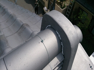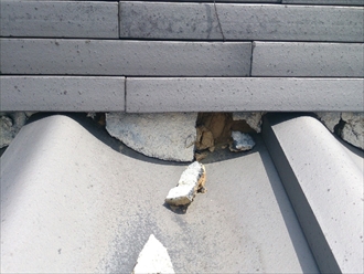 ここは、何故だかコーキングで補修がしてありました。お客様にお聞きすると、数年前に一度近所で工事をしていた屋根屋さんに直してもらったそうです。泥にコーキングは接着しないのですが、瓦の方にベッタリとコーキングが打ってあります。