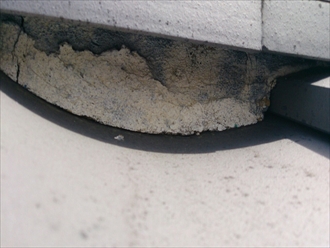 こちらの写真の方がわかり易いかもしれません。白い漆喰が剥がれて、茶色い泥が見えています。