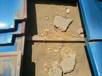 防水紙は問題ありません。今回は、ずれた棟を積み直して漆喰を詰める工事が必要です。放っておくと棟が崩れて雨漏りしますので、早目に工事が必要です。