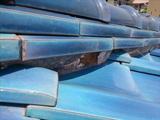 棟を固定している銅線があちこちで劣化して切れていました。のし瓦が段々開いてきています。棟が崩れ始める前兆です。