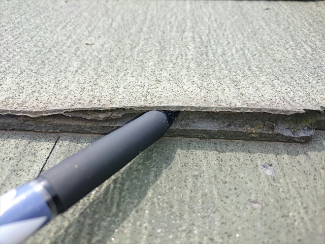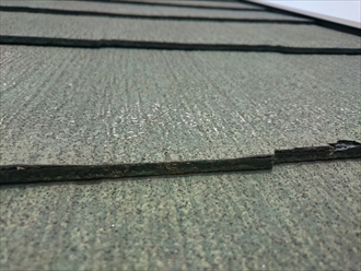 スレート葺きの屋根は、パッと見それ少し汚れの付着はありますがそれ程酷くは見えませんでした。しかし、近くでスレートをみると大分劣化が進行しているのがわかります。