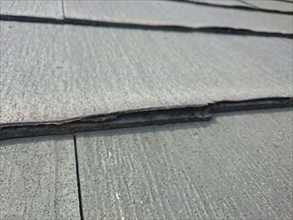 屋根に葺かれているスレートは、ニチハというメーカーの『パミール』です。アスベストの使用に規制がかかった後に出来た屋根材で、薄い材料を何層にも重ねて圧縮して造られているのですが、経年劣化によって薄い層がミルフィーユの様に剥離してしまう症状が出てしまいます。