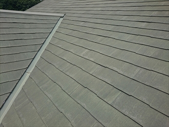 横浜市泉区で屋根の調査をおこないました。だんだん汚れが付いてきたのでそろそろ塗装をしたいというお問合せでした。ニチハというメーカーの『パミール』という屋根材を聞いた事ありませんか?古いスレート材には発がん性物質のアスベストが強度を上げる為に使われていたのですが、2004年以降はアスベストの使用が禁止されました。アスベストが禁止された後に造られたのがニチハのパミールで、強度に問題が有り画像の様に剥離してしまう現象が全国的に出ています。この様な状態になるとメンテナンスの方法で塗装工事は出来なくなりますので、下地が問題なければ上からガルバリウム鋼板などの金属屋根を被せるカバー工事が最適な方法です。