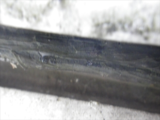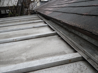ちょっと分かりにくいのですが、軒先部分を雨樋の隙間から撮りました。軒先水切りがコーキングでべっとりと塞がっています。雨押えから入った雨水が屋根材の裏側を回って軒先で出るのかと思いきや、コーキングで塞がってしまっているので、溜まってしまっているのが今の状態です。雨水によって野地板が傷んでしまっているので、一度瓦棒を剥がしてから葺き替え工事が必要です。主屋のスレート部分は傷みが激しいので合わせて葺き替え工事をご提案しました。