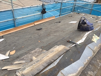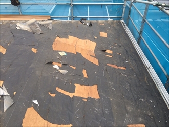 古いスレートを剥がしていくと、劣化して熱で溶けている防水紙が張り付いているので、一緒に剥がれてしまいます。