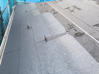 ルーフィングが敷き終わったら軒先部分から新しい屋根材を葺いていきます。新しい屋根材も今までと同じスレートです。軒先から横にスレートを並べていって、上の段を下の段に重ねて葺き上げます。画像を見てもらうと分かる様に、半分は下の段に重なります。棟まで葺き終えたら棟板金を取り付けて葺き替え工事が完成です。