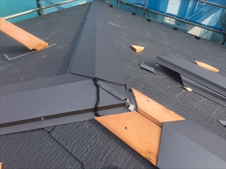棟まで葺きあがり、スレートの葺き替え工事が完成しました。メンテナンスをおこなっておらず表面がボロボロになっていましたが、新しくなって綺麗になりました。