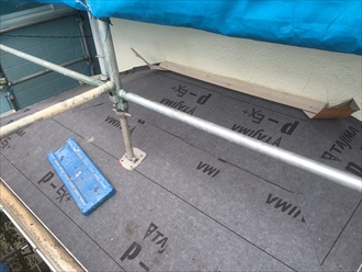 野地板を葺いた後は防水紙(ルーフィング)を敷いていきます。屋根材は屋根材の表面だけで雨水を防ぐのではなく、必ず屋根材の裏側にも雨水が回ってしまいます。それを防ぐのがルーフィングの役割です。ルーフィングがしっかりと敷いてあれば雨漏りする心配はありません。