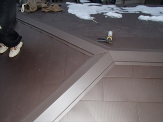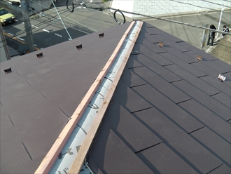 最後に、棟部に貫板を取り付け、板金を被せて貫板にビスで留めて完成です。