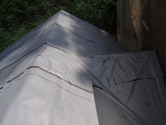 屋根を覆っていた養生のシートと、割れてしまった明り取りを撤去して下地工事を行います。プラスチック製の物置でたわみや歪みが出やすいので、粘着性の防水紙をはります。