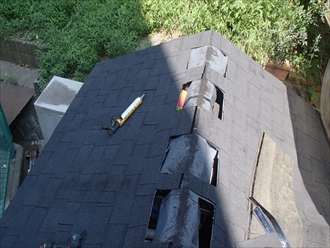 屋根に使用した材料はアスファルトシングルです。アスファルトを染み込ませたシートに自然石を貼り付けた材料で、柔軟性と弾力性がある材料です。明り取り部分を切り抜いて屋根全体を覆います。非常に柔らかいので、ボールが当たっても、屋根が割れたりする事もありません。