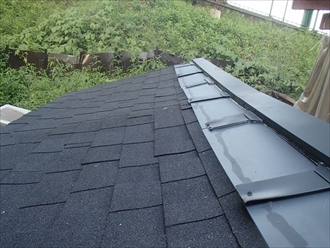 棟を板金で包んで完成です。屋根のたわみがわかると思いますが、屋根材を貼るのに非常に苦労しました。もともとの屋根の上にカバーしましたので、熱の伝わりも今までよりも緩和されます。物置の中は食品庫なので、温度上昇も抑えて一石二鳥です。