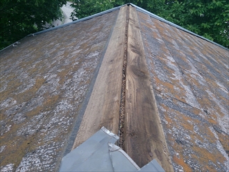 大屋根の棟が綺麗に飛んでしまっています。見たところ貫板に割れなどは見当たりません。