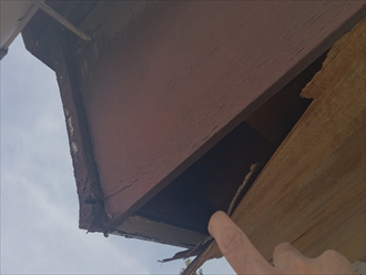 確かに軒天が剥がれてしまっています。ベニアが水を吸って剥がれてしまっているのですが、原因は破風板がそってしまい、ベニアが溝から外れて落ちてしまった事によるものです。