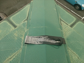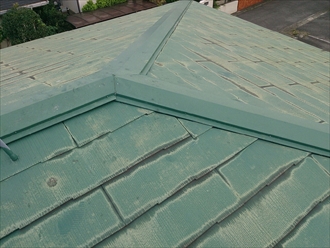 屋根全体です。棟板金もそうですがスレートの塗膜も劣化していました。浮いてしまった所をテープで押さえた跡があります。昨年の台風の後にテープで止めたそうです。