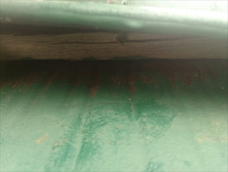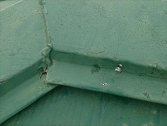 棟板金に釘の浮きがあります。スレートからも浮いてしまっているので強風によって煽られてしまうかもしれません。手で簡単に持ち上がります。