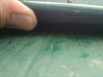めくると、貫板から釘が抜けていますが、貫板自体は固定されているので浮きはありません。雨水が回ったりした形跡も無く傷みは無い様です。このまま放っておくと煽られて飛んでしまうかもしれませんので、交換工事が必要になります。浮いた原因が台風ですので、風害がついている火災保険でしたら保険を使用して直す事が出来るので、まずはご加入の保険の内容を確認されると良いかもしれません。